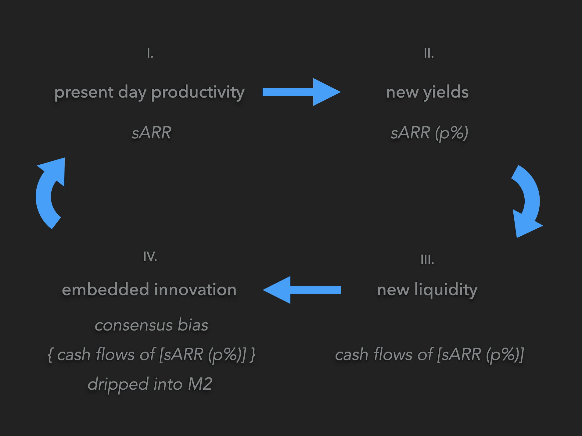 Each turn of leverage sourced by the enterprise is accountable to sARR and SSR. Sustainable annual recurring revenue and sustainably stored revenue can ensure the nascent burgeoning of enterprise value. Each turn of leverage builds the concentric network and wealth distribution niche.