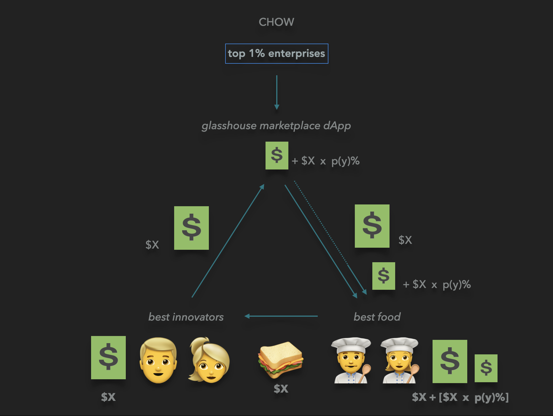 CHOW will portray an example of how all glasshouse enterprises can deploy a trade fee distribution strategy to extend and embed wealth. This formalizes the strongest possible stock-to-flow demand pull incentive.